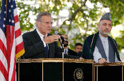 "Your leadership has shown great courage in efforts to unite the country's dispute groups and to understand and make the will of the Afghan people," Rumsfeld told the press while holding a joint news conference in the heavily-guarded Presidential Place.