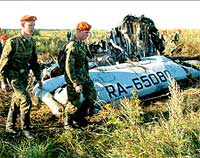 The wreckage of the Tu-134 was scattered near the village of Gluboky about 125 miles south of Moscow. The plane lay upside-down in a large hay field, its tail severed from the fuselage.