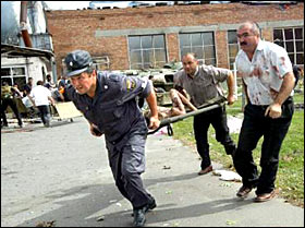 The violence began after militants had agreed to let Russia retrieve the bodies of people killed early in the raid. Explosions went off as the emergency personnel went to get the bodies at around 1 p.m., collapsing part of the roof of the building, and hostages took the noise as a signal to flee, officials said.