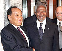 Annan and Li discussed the situation in Iraq, Sudan and Afghanistan, reform of the United Nations and the Korean Peninsula nuclear issue as well as China's participation in UN peacekeeping missions. Annan is in Beijing on a five-day official visit, which started on Saturday. He will meet President Hu Jintao today. He is also due to visit an eco-village and HIV/AIDS testing center, and tour the Chinese peacekeepers' training center at Langfang in north China's Hebei Province today. China currently provides some 1,000 military and police personnel for 12 UN peacekeeping operations. Annan Monday hailed the 25th anniversary of UN-China partnership as "a testimony to the strong partnerships the UN has forged in China." He said the UN had not only established partnership with the Chinese government but also with business and civil society in the nation. He added the partnership also applied within the United Nations itself "so that many parts of the UN system now work together to place our collective expertise at the disposal of the Chinese people." State Councillor Tang Jiaxuan also attended the 25th anniversary of the UN-China partnership. He highly praised UN agencies in China for their contribution to the country's reform and modernization cause. "Together we aimed at improving the well-being of Chinese nation and people and delivering the best we could," said Khalid Malik, resident coordinator of UN in China. At the ceremony, Annan presented UN awards to six eminent people, Li Lanqing, Huang Hua, Peng Peiyun, Deng Pufang, Wei Yu and Long Yongtu, who were recognized for the special contribution they have made to China-UN cooperation. To commemorate the anniversary, UN China held an exhibition in the garden of the Beijing office of the United Nations Development Programme to showcase the 25 years of collaboration between China and the UN. The exhibition consisted of eight booths, one for each of the UN Theme Groups established to coordinate the work of the various UN agencies working in China. The exhibition will remain until UN Day, 24 October, with special viewings organized for schools and community groups. Annan also delivered a speech at Tsinghua University yesterday. He called on the Chinese students to help ensure global security and achieve the UN's Millennium Development Goals. Annan said that with its large population and its rapid economic growth, China was being relied on to reach the Millennium Development Goals, set by world leaders in 2000. "It is theoretically possible that we might succeed in halving the proportion of very poor people in the world by 2015, simply because China had succeeded in lifting almost all its people out of that category, even if most countries in Africa still had the same proportion," said Annan. "I urge you all -- and your contemporaries throughout China -- to commit yourselves to finding answers to our century's great challenges of poverty, disease, and environmental degradation," he said. He also urged the students to "go out and make the world better." The UN chief also expressed his thanks to China for its participation in the UN peacekeeping mission in Haiti, saying that China is playing a greater role in dealing with threats and challenges to world peace and security, and helping the world to rebuild and improve the global security system in the 21st century. (China Daily October 12, 2004)