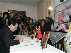 A few hours after Arafat's death was announced, Chinese President Hu Jintao sent a letter of condolences to Rawhi Fattuh, speaker of the Palestine Legislative Council. He said his death is not just a loss to the Palestinian people but also to the Chinese people who have been honored with Arafat's friendship.