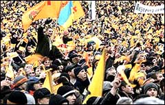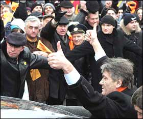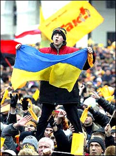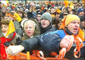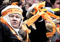 After dusk, more than a dozen busloads of Yanukovych supporters were seen parked on the fringes of downtown Kiev in the falling snow, and rumors persisted that provocateurs would try to infiltrate the rallies, disguising themselves by wearing orange armbands -- Yushchenko's campaign color.
