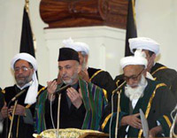 "I swear to obey and safeguard the provisions of the sacred religion of Islam, to observe the constitution and other laws of Afghanistan and supervise their implementation," said Karzai in repeating the oath of allegiance read to him by Afghan Chief Justice Mawlawi Fazl Hadi Shinwari, "with the assistance of God and the support of the nation, to make great and sincere efforts for the happiness and progress of the people of Afghanistan."