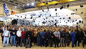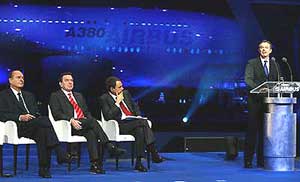 French President Jacques Chirac, as well as the leaders of Britain, Germany and Spain -- Airbus' other three government backers -- and CEOs from the 14 airlines and freight transporters that have so far ordered the A380 attended the elaborate ceremony at company headquarters in Toulouse, southern France.