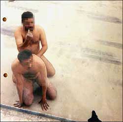 Another shows two naked Iraqis, their faces clearly visible as they turn to the camera with their thumbs up. One is directly behind the rear area of the other in what was described to the court as "simulated" anal sex.