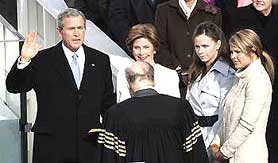 Chief Justice William H. Rehnquist, 80, ailing with thyroid cancer and the subject of retirement speculation, administered the oath of office. The 58-year-old president placed one hand on a family Bible and raised the other as he recited an oath as old as the Republic.