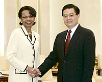 During her meeting with Hu, Rice said the US government attaches great importance to developing US-China constructive and cooperative ties, and that people around the world are watching the "remarkable transformation" that is going on in China.