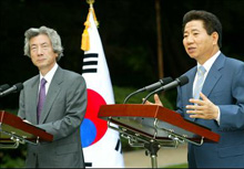South Korea wants Koizumi to end his annual visits to the Yasukuni Shrine, where convicted war criminals are honored. Seoul is also furious over a Japanese history textbook that it says whitewashes Japan's wartime atrocities. And the two countries dispute the ownership of the rocky islets the Koreans call the Dokdos. What should have been a news conference was limited to "joint remarks."