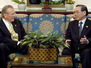 He also met with Defense Secretary Donald H. Rumsfeld at the Pentagon. Military ties between the two countries have included periodic docking of US warships in Vietnam, plans for US military training of Vietnamese officers, intelligence sharing and cooperation on counter-terrorism activities.