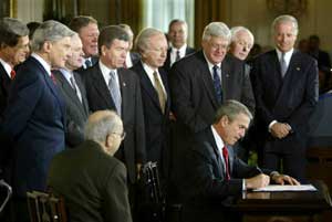 Among the dozen lawmakers who were invited to stand on stage with Bush at the signing ceremony were Sens. Joe Lieberman, D-Conn., John McCain, R-Ariz., Joe Biden, D-Del., minority leader Trent Lott, R-Miss. and John Warner, R-Va.