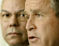 "Saddam Hussein will be stopped," Bush pledged, warning anew that the United States will act along with allies if needed. He spoke before cameras in the White House's Roosevelt Room with Secretary of State Colin Powell at his side. Behind the president was a painting of Theodore Roosevelt, who led the United States into war with Spain in 1898, on horseback.