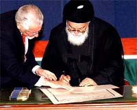 Headed by IGC President Mohammad Bahr al-Uloom, the 25 members signed the landmark document one by one, applauded by a gathering including US civil administrator for Iraq Paul Bremer.