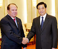 Hu pointed to the remarkable results of bilateral exchanges and cooperation in such fields as economy, trade, agriculture and culture in recent years thanks to efforts from both sides, as well as the sound communication and coordination between the two countries in international and regional affairs.