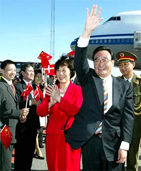 Wu Bangguo, chairman of the Standing Committee of the Chinese National People's Congress, arrived in Copenhagen on Monday for an official good-will visit aimed at promoting bilateral ties.