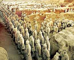 To date, the tomb of the Emperor Qin has not been excavated. But his buried terracotta army unearthed nearby has already stunned the world and has been called the “eighth wonder of the world”. They are the largest pottery figurine group ever unearthed in China. So far, three pits containing such figurines have been excavated. They cover a total area of 20,000 square meters. Some 8,000 life-sized warriors demonstrate a powerful military array under the rule of the First Emperor of the Qin Dynasty, 2,200 years ago.
