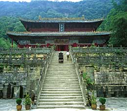 The most distinguishing feature of Mount Wudang is the large Taoist architectural complex. Making full use of the terrain featuring towering mountains and deep valleys, more than 20,000 rooms were built in spots where they most harmoniously blended with the nearby woods, rocks and streams so that the man-built structures and natural elements complimented each other. The Gold Hall, built in 1416 on the top of the Heavenly Pillar Peak, is the largest copper structure existing in the country. It is 5.54 meters tall and 5.8 meters wide. The walls were cast separately, but precisely and well knit. All the statues of god and sacrificial vessels are made of copper. Although 500 years have past, they still glitter as before.