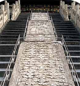 The Altar of Prayer for Good Harvest, 38 meters in height and 30 meters in diameter, stands on a round foundation built with three levels of marble stones. This towering triple-eave hall is under a three-story, cone-shaped glaze-tile roof in blue color crowned with a gilded knob. A circular wall of polished bricks known as the Echo Wall encloses the Imperial Vault of Heaven. The Circular Mount Altar, south to the Imperial Vault of Heaven, is where the emperor prayed to heaven. At the center lies a round stone called the Center of Heaven Stone that echoes when a visitor speaks loudly when standing on the stone.