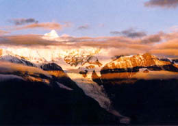 Highest among them at 6,740 meters is the snow-capped Meili Mountain with its 10,000-year-old glaciers. Crystal-clear and sparkling, the ice makes its way very slowly from high on the peak down to the Mingyongcun Forest at 2,700 meters. It is considered to be the world's finest monsoon glacier and remarkable for its descent to such a low altitude. For thousands of years, Tibetan people have regarded the Meili as a holy mountain. To this day they respect the need to obtain permission before going on the mountain.