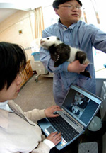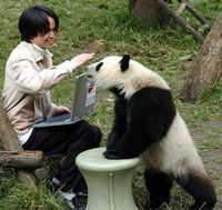 Staff members of China Conservation and Research Center of the Giant Panda observe a panda cub and surf the wireless communication network to update information about giant pandas in Wolong, southwest China's Sichuan Province, Oct. 25, 2004.