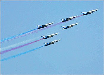 When the No. 5 aircraft flew over spectators at just 30 meters -- the minimum altitude permitted -- at 900 kilometers an hour releasing colourful fireworks, the audience burst into thunderous applause.