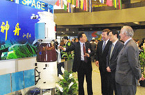 An official (L) of the Foreign Affairs Department of the Chinese National Space Administration, introduces the model of China's Shenzhou Spacecraft No. 1 to Dr. Camacho (L2), director of the United Nations Office for Outer Space Affairs, and Gonzalez (R1), chairman of the United Nations Committee on the Peaceful Uses of Outer Space, at the Chinese Outer Space Exhibition, held in Vienna, Austria, Feb. 17, 2003.