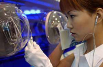 An employee from an electronic company demonstrates the latest MP3 product during the opening of the 2003 China International Electronic Information Technology Exposition in Nanjing, capital of east China's Jiangsu Province, April 9.