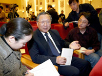Lu Yongxiang (C), president of Chinese Academy of Sciences, talks with reporters during the interval of the opening ceremony of a forum on the humanities for Chinese scientists held in the Great Hall of the People in Beijing April 15. About 800 people including delegates of the scientific and technological circle took part in the forum.