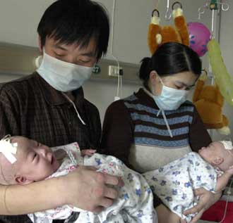 Parents hold twin sisters Sunday at the First Hospital of Hebei Medical College. The hospital separated the girls who were conjoined at the chest and belly on February 14. The infants are in stable condition and each drinks up to 400 ml of milk each day.