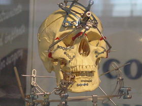 A model of skull displayed at a stand of a plastic surgery equipment company.