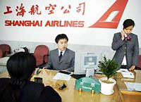 Staff from Shanghai Airlines central ticket counter start to sell tickets for non-stop cross-Straits charter flights for Taiwan business people yesterday. The airlines' 11 ticket counters in the city have started such service. The first flight of Shanghai Airlines will take off from Shanghai for Taipei at 8:45 am on January 29, with return journey costing 3,000 yuan (US$363) while a single trip pricing at 1,500 (US$181). About 100 Taiwan business people have booked seats on the first flight by press time.