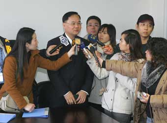 Tung Wei, a deputy director of ground service department of Taiwan-based China Airlines in Shanghai, answers questions from journalists in Shanghai January 19, 2005 after signing a ground service agreement of direct across-Straits flights.