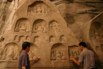 Two workers are cleaning the "Longtan River's Cliffside Carving," the heaviest cultural relic of the museum.