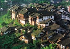 First emerging in the late Song Dynasty, Fubao Town took shape during the Ming Dynasty. Encircled by mountains and waters, the town is still in the style of the Ming and Qing. Rows of stilted wooden buildings span the hillside. Between them are flagstones that wind and meander upwards to the mountain, some as wide as 4 meters, others so narrow as to require walking in single file. Most of the buildings are two-story. Business is conducted in the rooms facing the street, and domestic life goes on in those at the rear. White walls, gray tiles, and paved blue-stone courtyards are characteristic features of southern Sichuan dwellings.