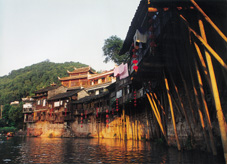Fenghuang City is most famous for its Miao-style tilted houses. These are two-story wooden structures whose lower stories are supported by several heavy logs standing tilted on the ground, and whose large, wide upper stories lean over the river. The upper story is beautifully crafted and decorated, with up-turned eaves and carved windows, doors and railings. The lower story has no living rooms, but the tilted sections are ornately carved. There are now only one dozen Qing Dynasty and early Republican period tilted houses extant. These are in Huilongtan, and many are rented out as holiday accommodation at a monthly rental of less than 200 yuan. Overnight visitors pay only 20 yuan, but buying such a house would cost over 500,000 yuan.