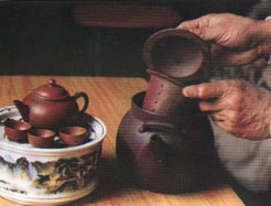 To avoid creating foam and scattering the fragrance of tea, the teapot should be held close to the teacups. When the tea is ready, the teacups are presented to guests and elders with both hands.