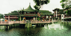 The predecessor of the Yuyuan Shopping Center--the Chenghuang Temple--was widely known in Shanghai. Most of the buildings in the Chenghuang Temple were built before 1911 in the ancient Chinese architectural style. Small shops stood in order, selling a wide array of goods. The Chenghuang Temple was known as the Kingdom of Snacks, offering various local-flavored snacks, including sweet pastries, vegetable-stuffed buns, eight-treasure rice pudding, and fermented glutinous rice balls. Time-honored shops, such as Laomiao Gold Shop, Yayi Gold Ornaments, Tonghanchuntang Drug Store, and Yuyuan Small Commodities, were assembled here. There were also shops dealing in special commodities and food, such as pear-essence candy, effective in relieving a cough, reducing phlegm, moistening the throat, and stimulating the appetite, and five-flavored beans, made using a 60-year-old recipe. The Chenghuang Temple has become a must for domestic and foreign visitors to Shanghai.