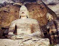 The Yungang Grottoes, 16 kilometers west of the city of Datong, were hewn from the cliffs in a honeycomb pattern and stretch for a kilometer from east to west.