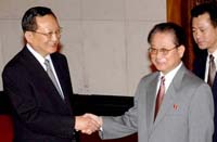 Chinese State Councilor Tang Jiaxuan meets six-party talks delegates in Beijing on August 29, 2003.