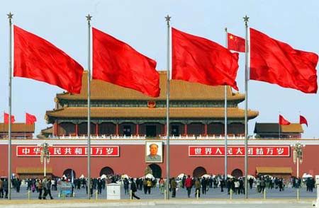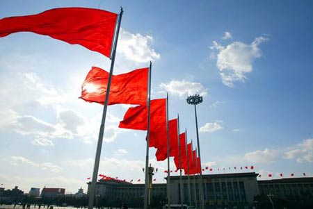 Drapeaux rouges flottant sur la Place Tian'anmen