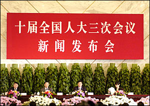 Jiang Enzhu, porte-parole de troisième session de la Xe APN a donné le 4 mars une conférence de presse au Grand Palais du Peuple.