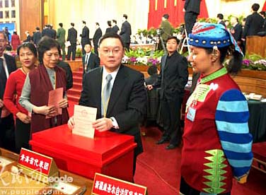 Hu Jintao a été élu président de la Commission militaire centrale d'Etat par une majorité écrasante de 2 886 voix pour, 6 voix contre et 5 abstentions sur les 2 901 députés présents à la session de l'Assemblée populaire nationale (APN, parlement).