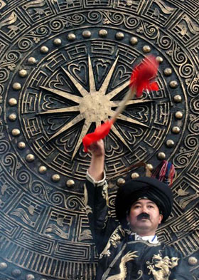 La Danse du tambour de bronze. Instrument d'accompagnement, le tambour de bronze a une face, il est vide et sans fond. C'est une danse représentative de plusieurs ethnies minoritaires vivant dans le sud de la Chine. Celle des Miao est représentée avec un tambour de bronze suspendu au milieu du terrain. Le tambourineur tient dans une main une baguette de bois battre la taille du tambour, et tient dans l'autre main une baguette couverte de peau battre l'unique face du tambour. Les danseurs forment un cercle et piétinent au son rythmique du tambour. Au moment joyeux, ils claquent les paumes et émettent des hai-he-he. Les gestes prennent source de la chasse, du travail agricole, comme faire du cheval, conduire des canards, pêcher du poisson et prendre des crevettes à la main.