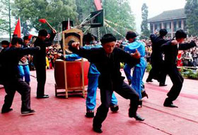 Danse rituelle. Normalement, elle est exécutée avec l'accompagnement de tambours et de gongs. La plupart des danseurs sont des personnes d'age moyen et agées. On utilise des Lusheng longue d'entre un et trois mètres.