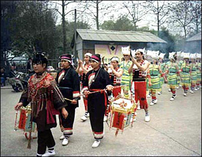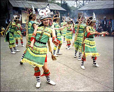 à cette occasion, 20 gar?ons et filles sont drapés des fausses peaux du chat et dansent. Chacun porte une coiffe de paille avec une masque de chat sur le front, et tra?ne derrière lui une tresse de paille comme la queue de chat sur laquelle sont plantés des encens allumés. En dansant, les danseurs et danseuses changent sans cesse de l'ordre, et imitent les mouvements du chat. Peu après, ils se reculent pour accueillir le grand dieu de chat. Il est figuré par deux personnes drapées d'une fausse peau du chat noir. Une personne tient la tête en noir et blanc, l'autre, par derrière, penche en avant et tient son compagnon par la ceinture. D'abord, le chat noir fait un tour sur la scène, puis grimpe en haut le long d'un poteau pour chercher les souris, enfin descend et se cache de c?té.