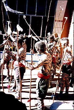 Au fond d'hiver, des jeunes hommes, torse nu, se peignent des zébrures de tigre sur le visage et le corps, font de leurs cheveux plusieurs petites nattes, se déguisent en tigre furieux. Normalement, il y a deux grands ? tigres ? et cinq petits, chacun portant un sabre long ou cour à la ceinture et prenant deux grosses branches d'arbre sur lesquelles sont collés des tableaux magiques. Après avoir accompli des rites religieux, ils commencent à danser en cercle en imitant les mouvements du tigre. Un sorcier frappe le tambour de coup fort afin de les rythmer. Le style est énergique, le rythme, varié.