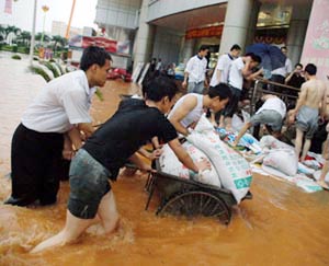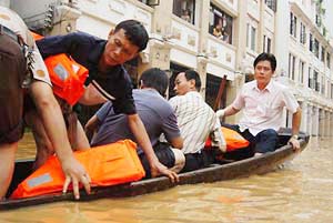 Mercredi à 6h00, les crues sont passées au-dessus de la digue est de la ville de Wuzhou. Quelque 100 000 habitants ont été déplacés immédiatement ainsi qu'une grande quantité de matériaux.