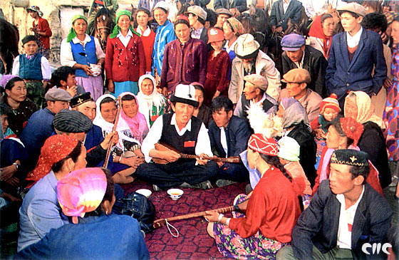 Des Kazakhs chantent en jouant du dombra