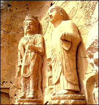 Die Binyang-Grotte besteht aus drei H?hlen und ist die pr?chtigste der Grotten aus der Wei-Dynastie. Von der Decke h?ngen Vorh?nge und bunte Seile herab, in den Boden wurden Lotosblumen geschnitzt. Die W?nde des Grotteneingangs sind mit gro?en Reliefs des Kaisers und der Kaiserin dekoriert. Sie bieten anschauliches Material zum damaligen Leben.