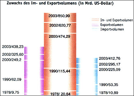 Auf der internationalen Handelsrangliste ist China bereits vom 32. Platz 1978 über den 15. Platz 1989 und den 10. Platz 1997 auf den 6. Platz 2001 vorgerückt. 2003 stieg das gesamte Im- und Exportvolumen Chinas auf 850,99 Milliarden US-Dollar, ein Anstieg um 37,1% gegenüber dem letzten Jahr, und stand an der 4. Stelle auf der Handelsrangliste der Welt. Gegenw?rtig pflegen mehr als 220 L?nder und Gebiete mit China Handelsbeziehungen. Die zehn gr??ten Gesch?ftspartner Chinas sind Japan, die USA, die Europ?ische Union, die Sonderverwaltungszone Hong Kong, die ASEAN, die Republik Korea, die Provinz Taiwan, Australien, Russland und Kanada.