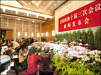 Heute Nachmittag um 15.00 Uhr fand die erste Pressekonferenz der 3. Tagung des 10. Landeskomitees der Politischen Konsultativkonferenz des Chinesischen Volkes (PKKCV) in der Gro?en Halle des Volkes statt. Der Sprecher Wu Jianmin informierte in- und ausl?ndische Journalisten über die Tagesordnung der bevorstehenden Tagung.